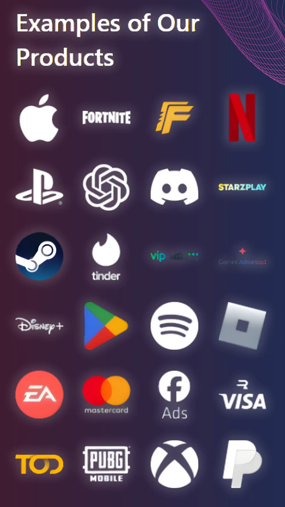 Offering a wide Range of Products including Gift cards, Online Subscriptions/IPTV, Game/items, Software...